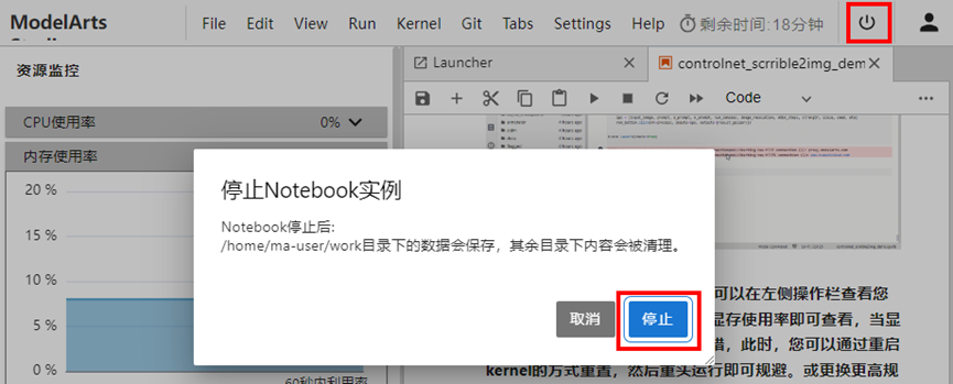 实验完成后,点击右上角停止Notebook实例按钮,选择停止,释放资源。