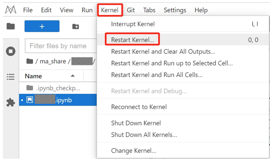 重启Kernel方式:点击左上工具栏中的Kernel->Restart Kernel,如下图所示
