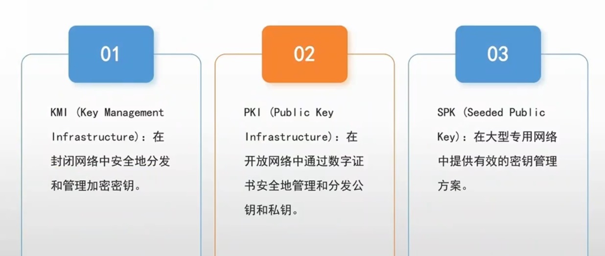 PKI (Public Key Infrastructure):在开放网络中通过数字证书安全地管理和分发公钥和私钥。