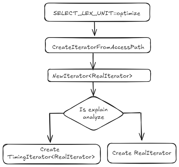 数据库优化器在确定了最优的访问路径(AccessPath)之 后,会通过函数 CreateIteratorFromAccessPath 生成执行树,该函数会依据算子类型,调用NewIterator函数生成对应的算子。如果是普通DQL(SELECT)语句,则生成对应的算子;如果是 EXPLAIN ANALYZE语句,则生成一个 TimingIterator< RealIterator> Wapper对象,其中,真实的执行算子被保存在 TimingIterator::m_iterator 中。