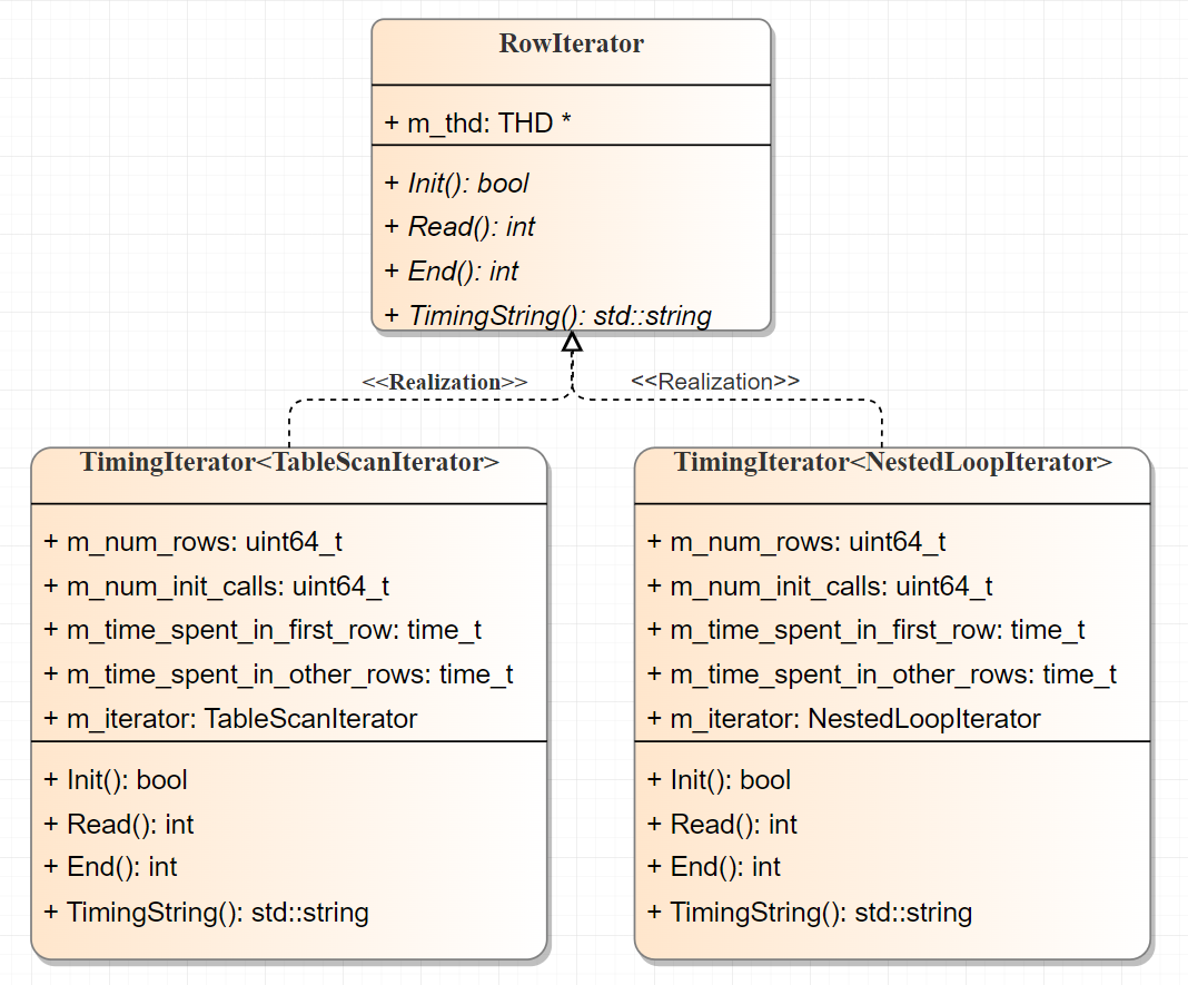 图2 TimingIterator<TableScanIterator> 和 TimingIterator<NestedLoopIterator> 类图
