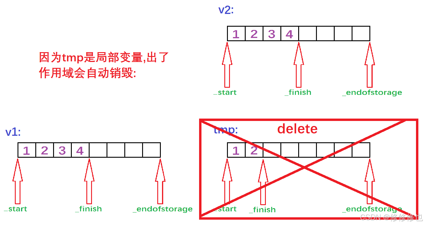vector的拷贝构造函数就是要根据传入的参数vector来重新拷贝构造一个新的vector,对于vector类型,我们不仅要防止vector本身浅拷贝,还要防止vector中的对象浅拷贝,对于这个问题我们会在后面reserve()函数中详细剖析,在这里简单来讲就是,我们不能通过浅拷贝的方式来拷贝vector中的对象的数据,而应该主动调用对象本身的赋值函数来完成其本身的深拷贝,代码如下: