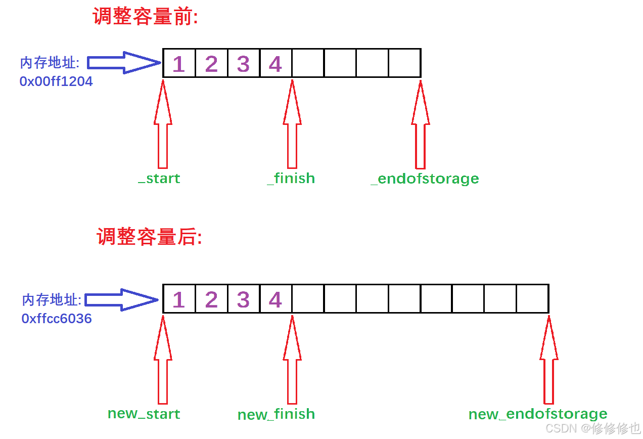 • iterator类型成员变量_endofstorage,是指向vector最后一个有效容量的后一位置的迭代器.