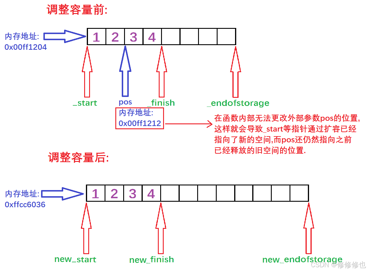 编辑 在insert函数内部,迭代器失效问题的解决方法就是在扩容之前设置一个变量,提前记录一下pos相对于_start的相对位置,然后在容量调整后就可以借助这个变量准确更新pos的位置了.