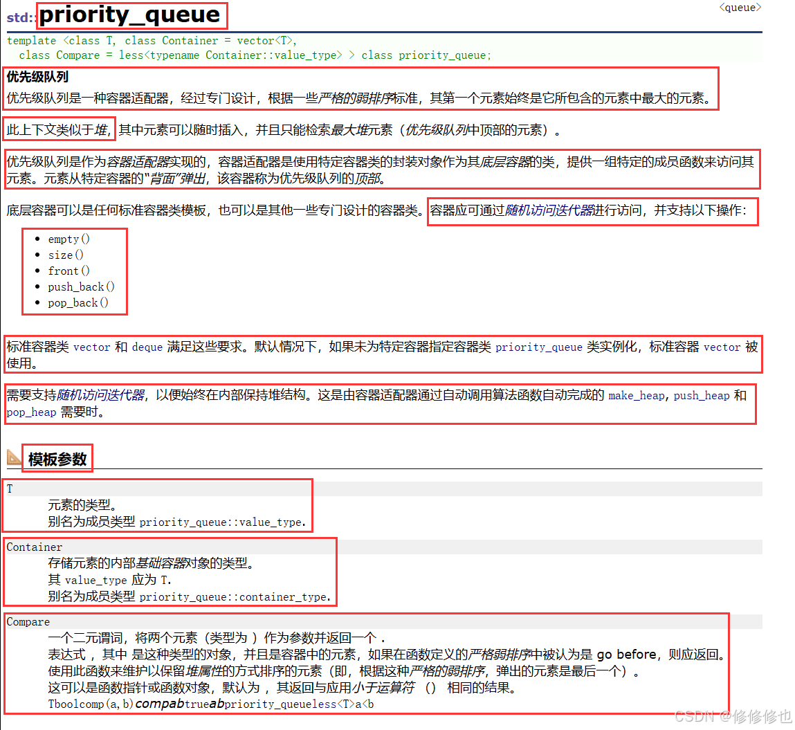 在本次项目中我们的目标是模拟实现一个priority_queue,先一起看一下C++标准文档中priority_queue的定义: cplusplus : C++ priority_queue 标 准文档