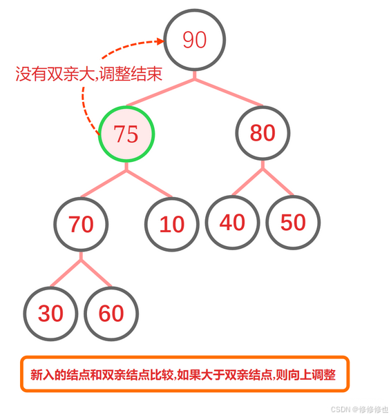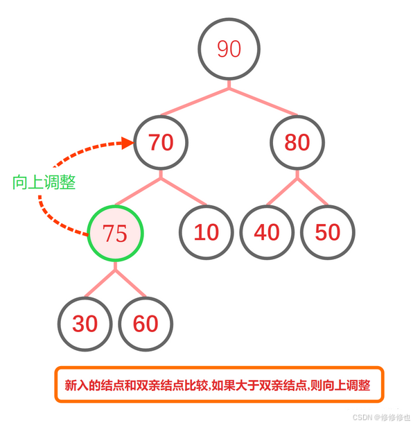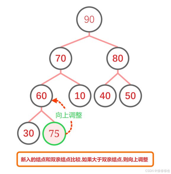 因为我们不能保证新入的元素一定完全符合堆定义的要求,为了防止新插入的元素破坏堆的性质,因此我们需要对新入堆的元素进行向上调整,直到调整到其满足堆排序的性质为止.