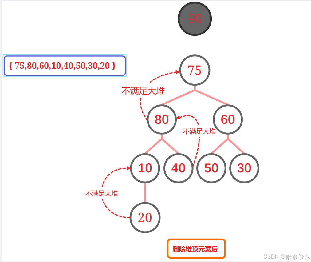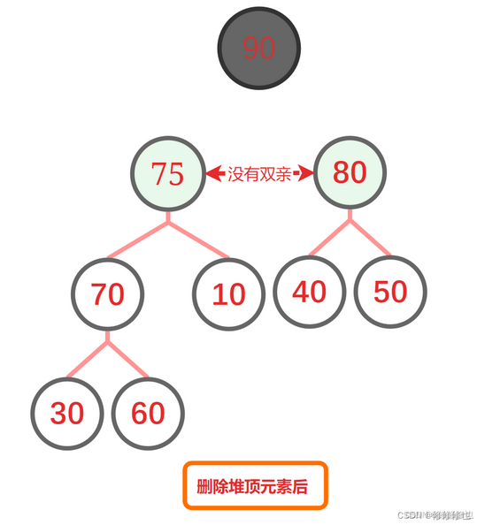 但是我们不能直接将堆顶元素删除,因为这样会导致堆中剩下的元素关系全部乱掉: