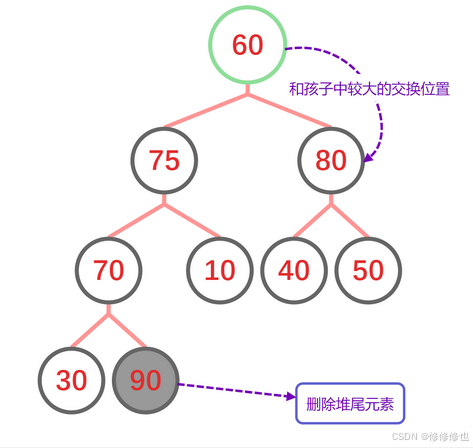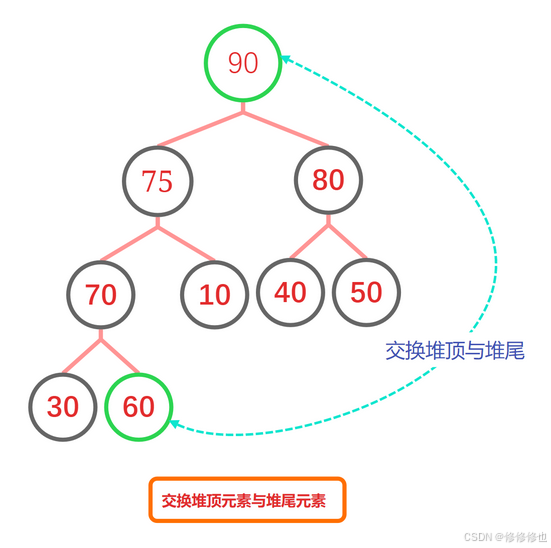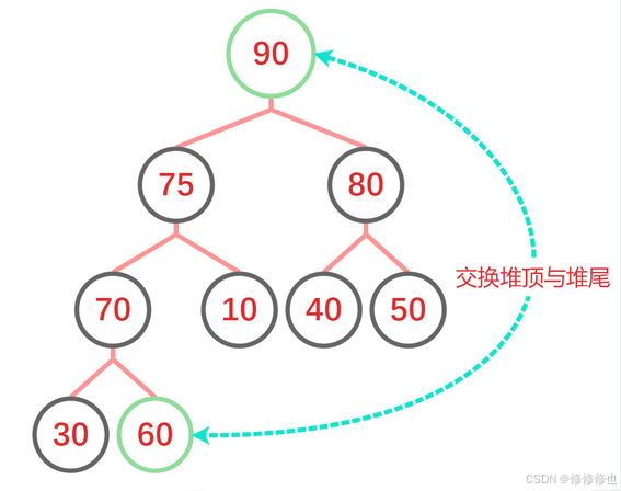 首先是交换堆顶和堆尾元素: