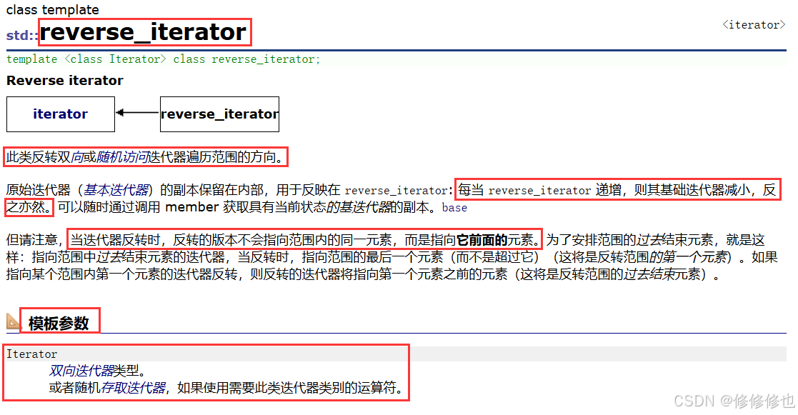 在本次项目中我们的目标是拟实现一个reverse_iterator,先一起看一下C++标准文档中reverse_iterator的定: cplusplus : C++ reverse_iterator 准文档 https://legacy.cplusplus.com/reference/iterator/reverse_iterator/?kw=reverse_iterator ​编辑