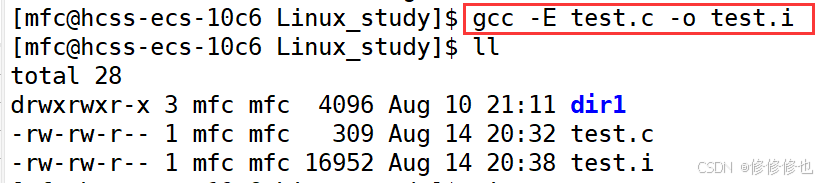 然后我们使用gcc的只激活预处理选项,将生成的文件定向输入到新文件test.i中: