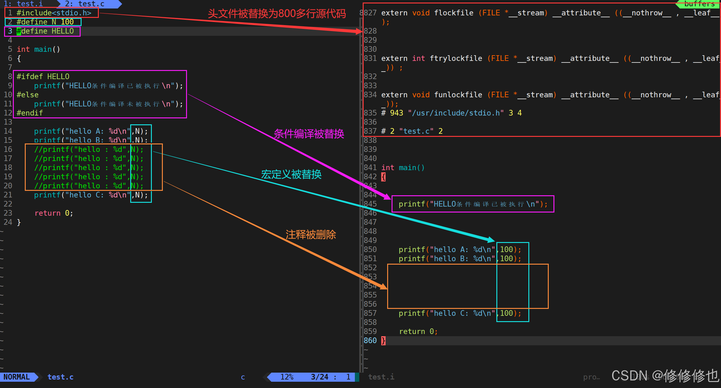 接着使用vim打开test.i文件查看预处理结果: