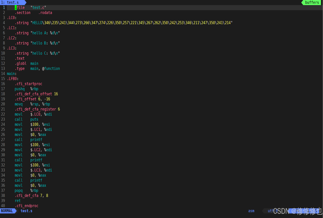 使用vim打开生成的新文件test.s, 可以发现之前的文件已经被转换成了汇编语言: