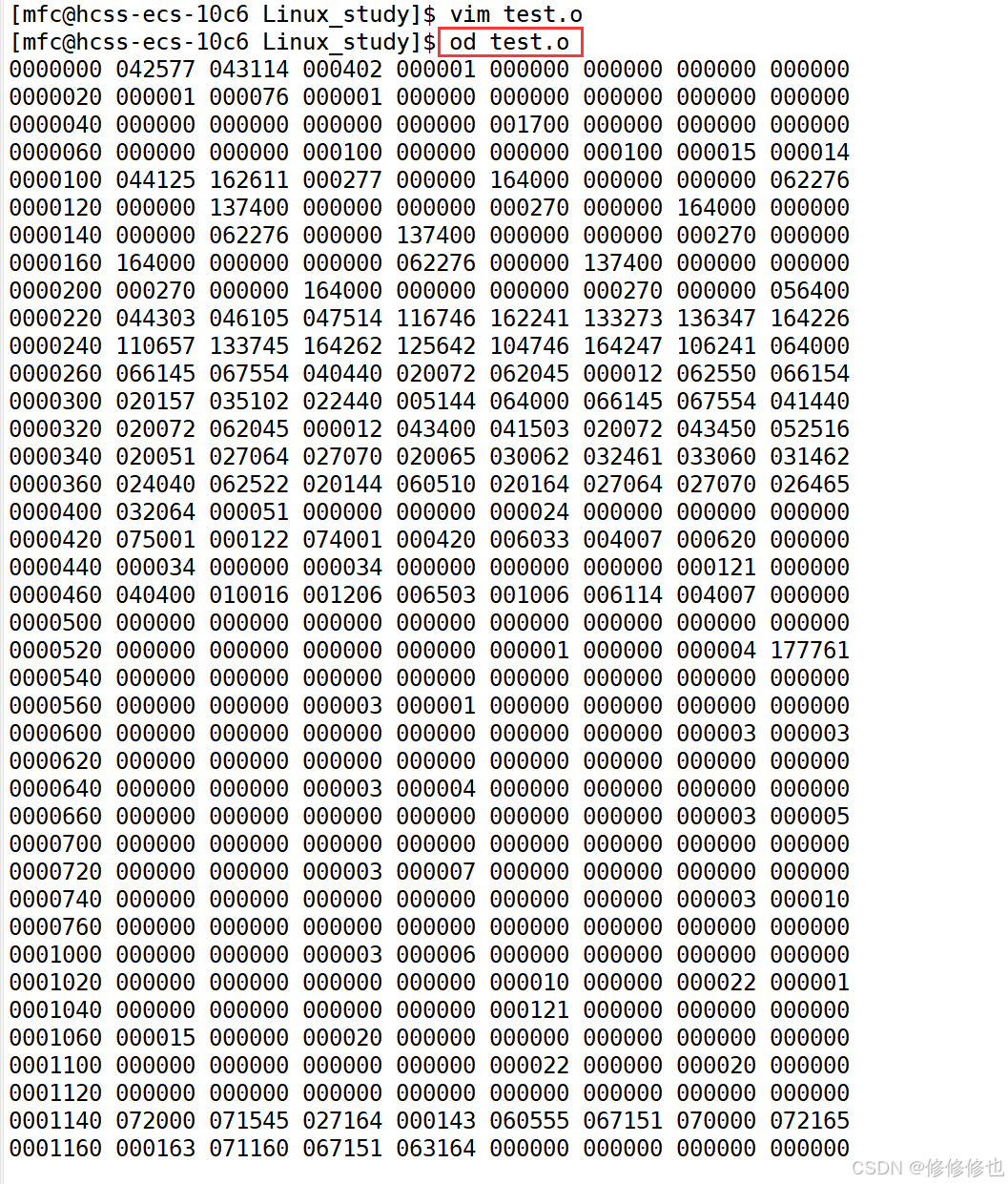 这是因为vim是文本编辑器, 它只能识别文本内容, 不能识别二进制内容, 那么我们可以选择使用二进制查看工具"od"来查看这个二进制文件: