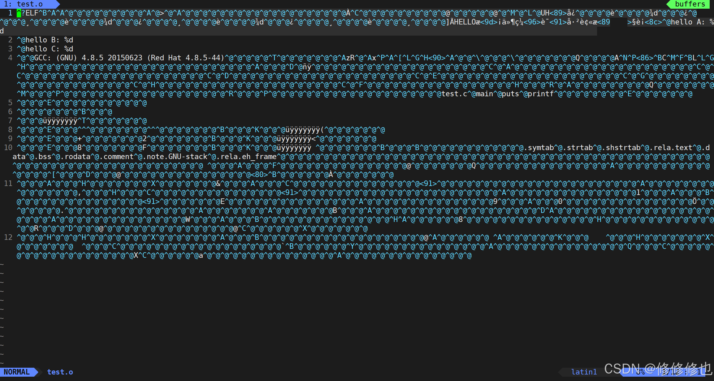 然后我们使用vim打开新生成的test.o文件, 发现是乱码: