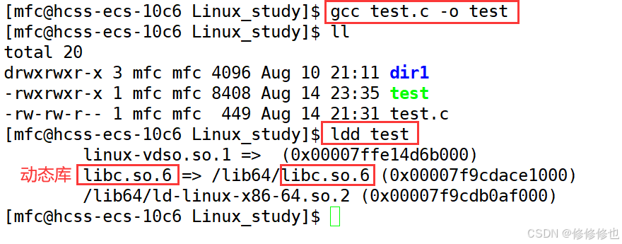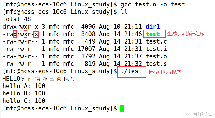 我们利用gcc来将test.o二进制文件和库连接,生成可执行程序test: