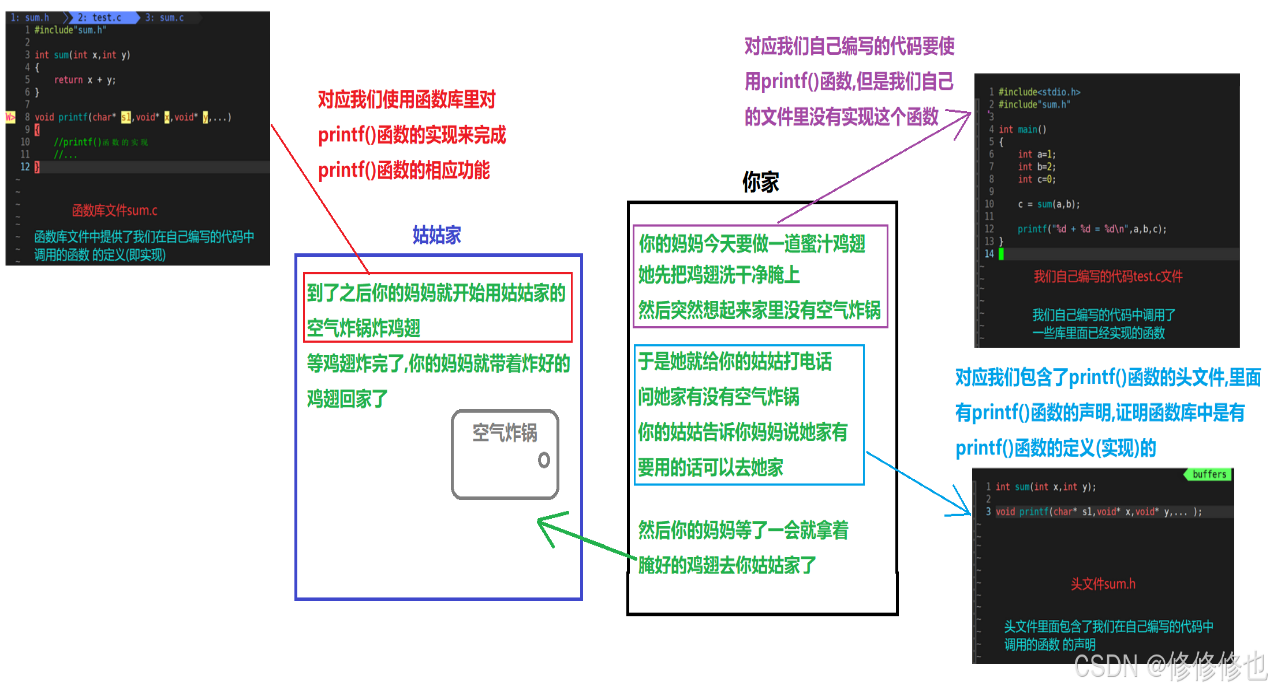 这是因为,库中有我们调用的C语言函数的定义, 它们三个的关系如下图:
