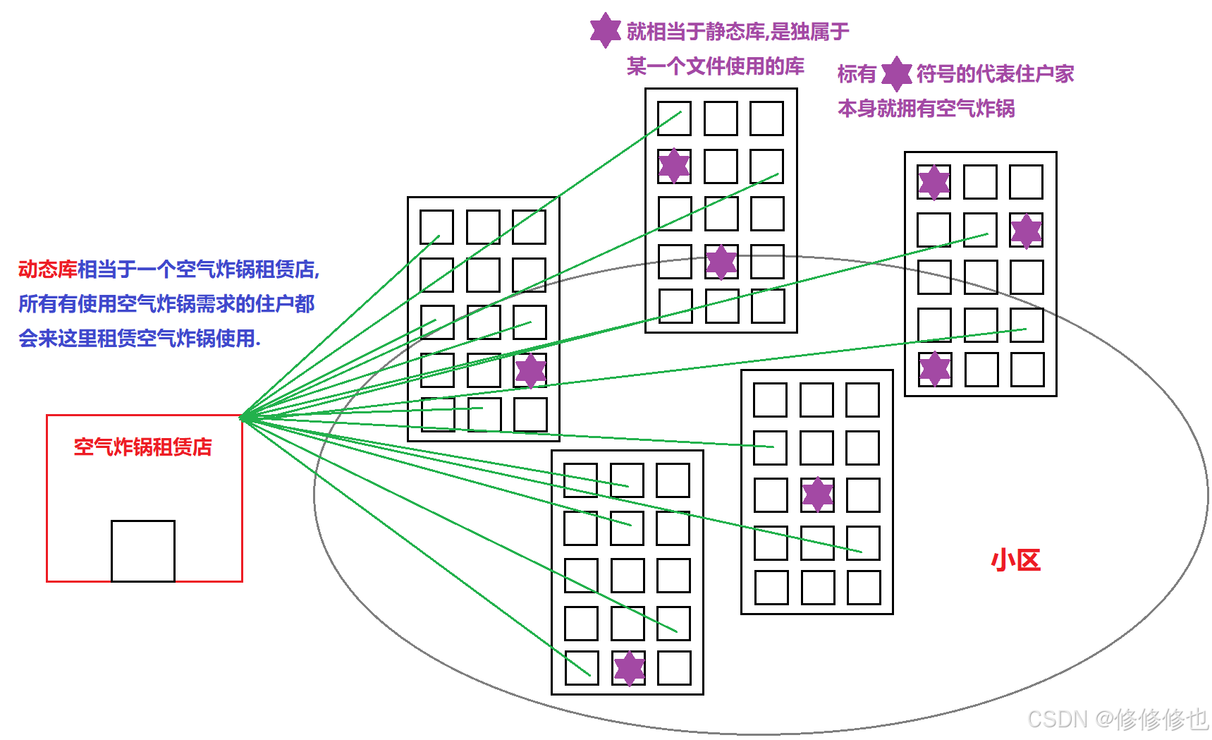 • 在编译器使用静态库进行静态连接的时候,会将自己的方法拷贝到目标程序中,该程序以后不用再依赖静态库。这个就类似将空气炸锅一次性买回家,后面再需要用的时候就不用再出去租赁了。但是相应的, 空气炸锅放在家里的话也会占据家里的空间, 静态库拷贝到程序里也会导致程序变大。