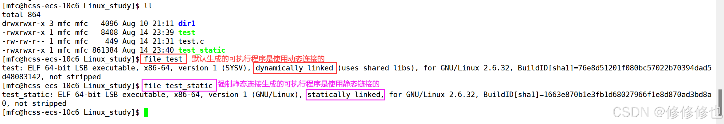 gcc默认生成的二进制程序,是动态链接的,也可以通过 file 命令验证: