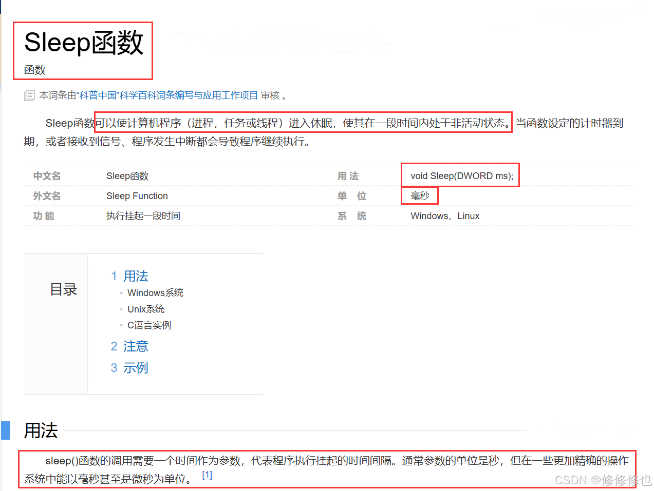 我们先来看一下百度百科网站上Sleep()函数的基本信息: