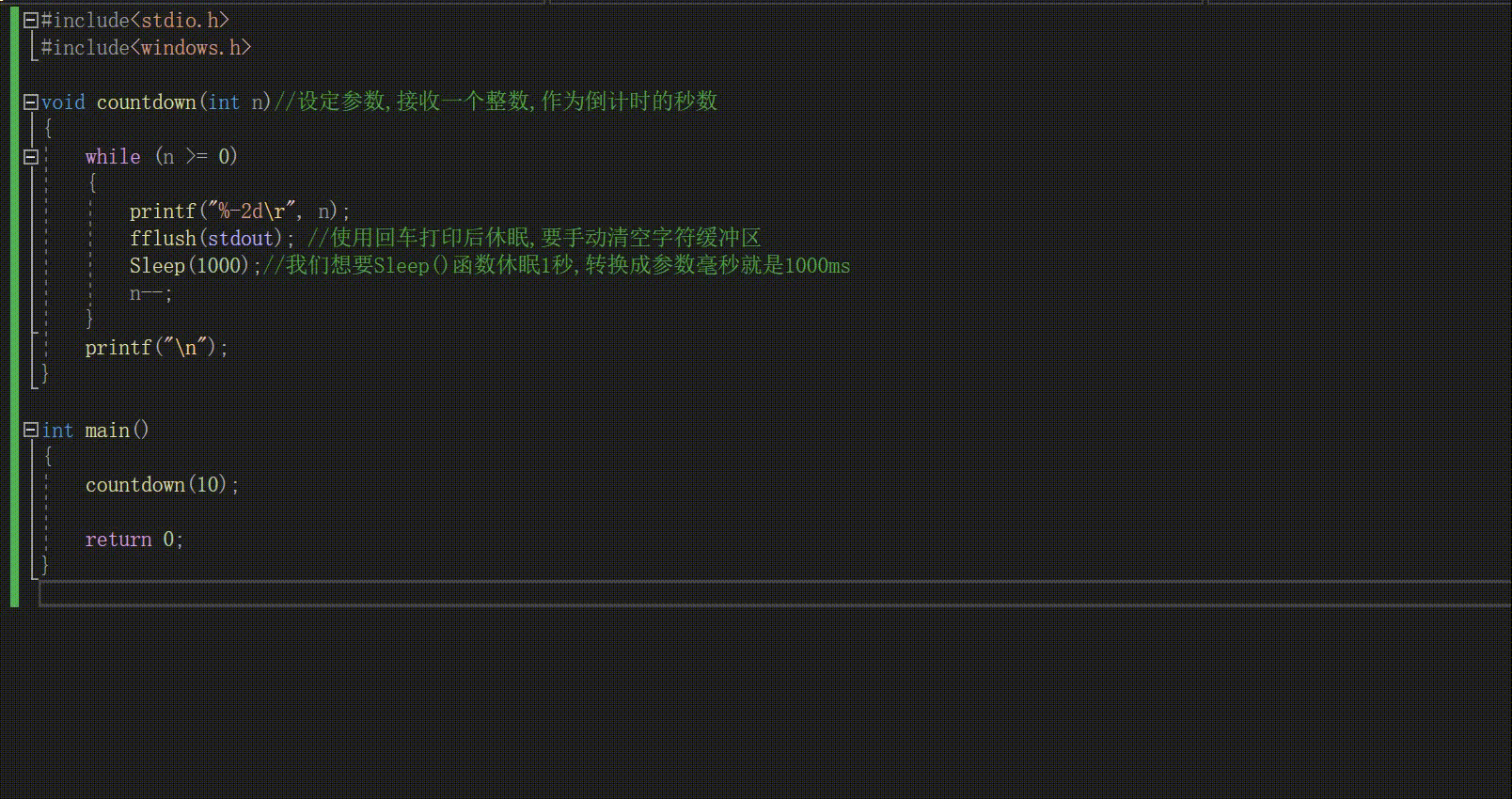 如下,我们使用Sleep()函数完成一个简单的倒计时小程序: