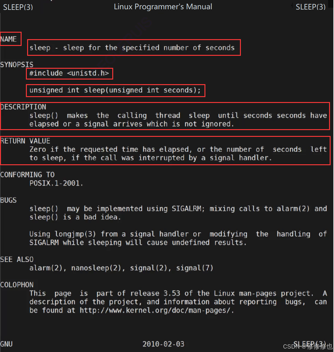 我们先来看一下Linux手册上的sleep()函数的基本信息: