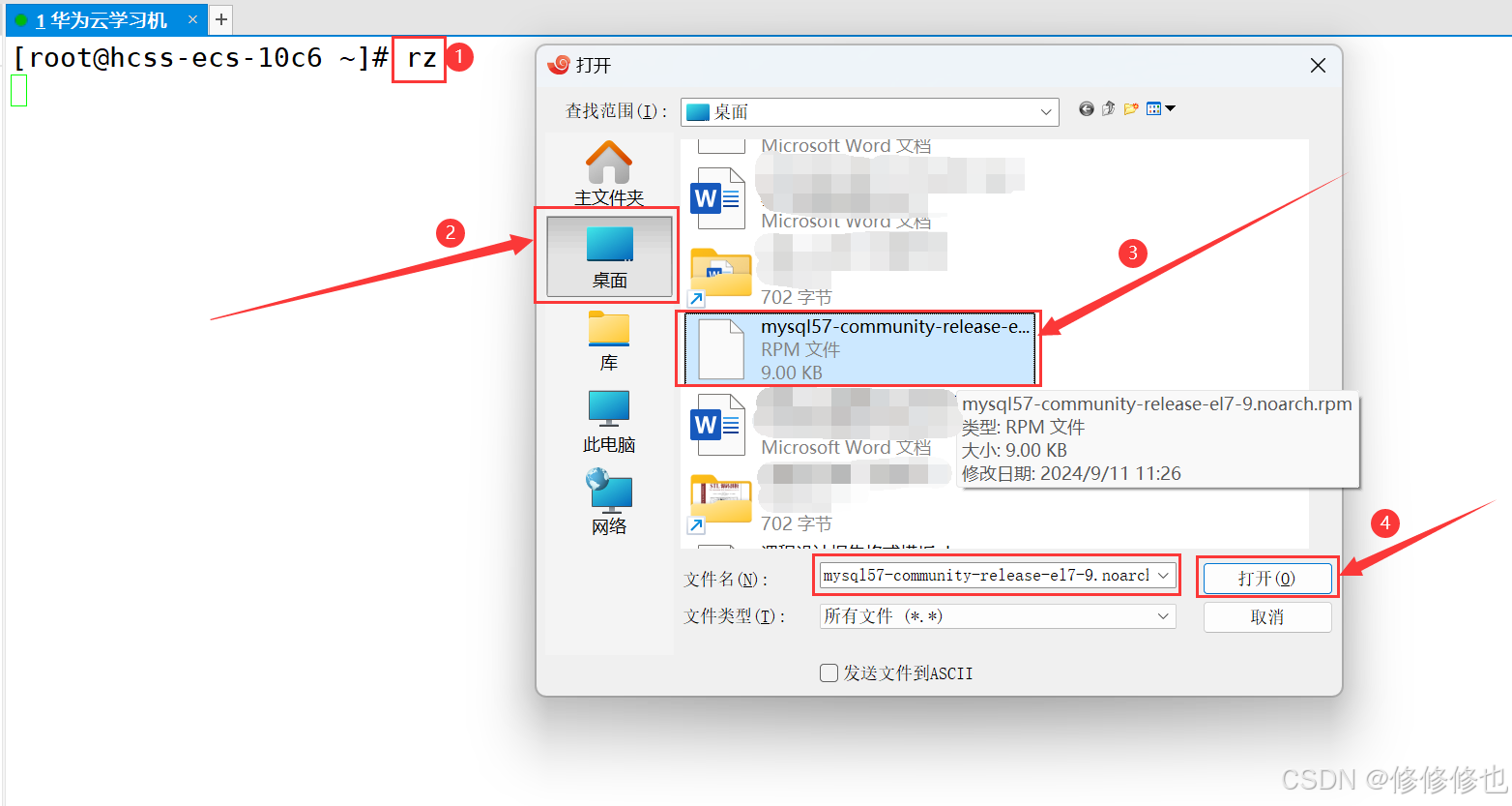 然后把桌面的下载压缩包传进来,输入rz指令把安装包上传到Linux系统中: