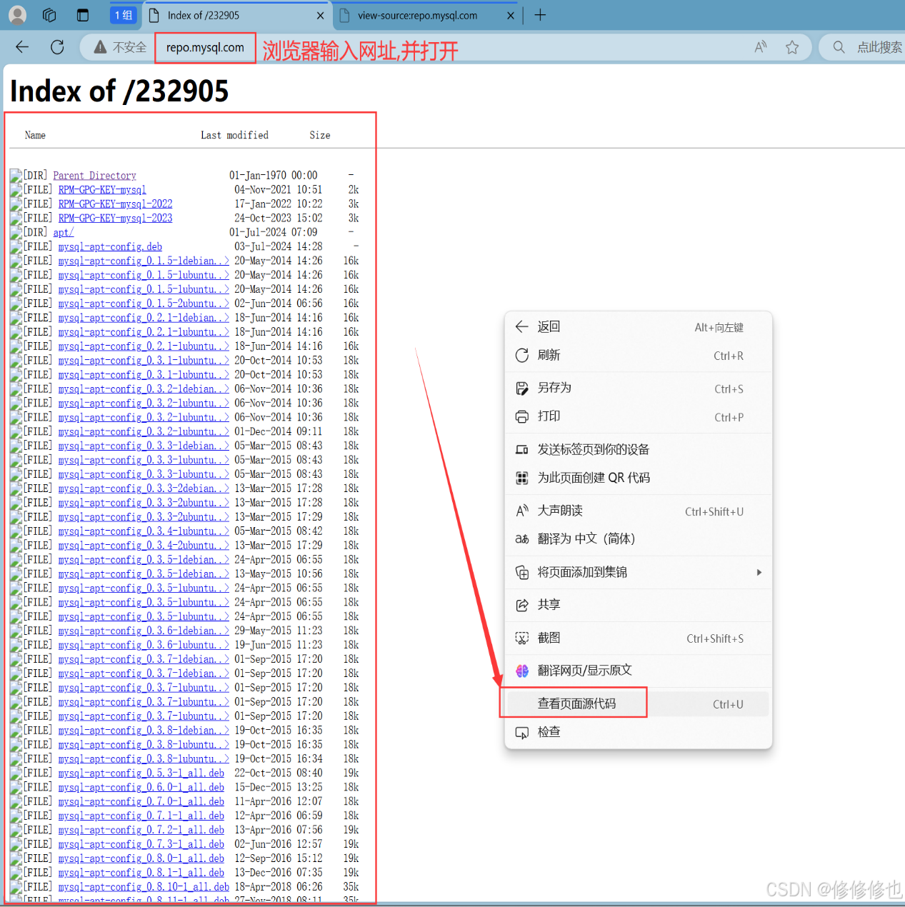 然后我们浏览器打开http://repo.mysql.com/ 网站获取官方yum源,但是直接打开它的排版太狭窄,导致我们看不清除,所以我们直接鼠标右键点击"查看页面源代码":