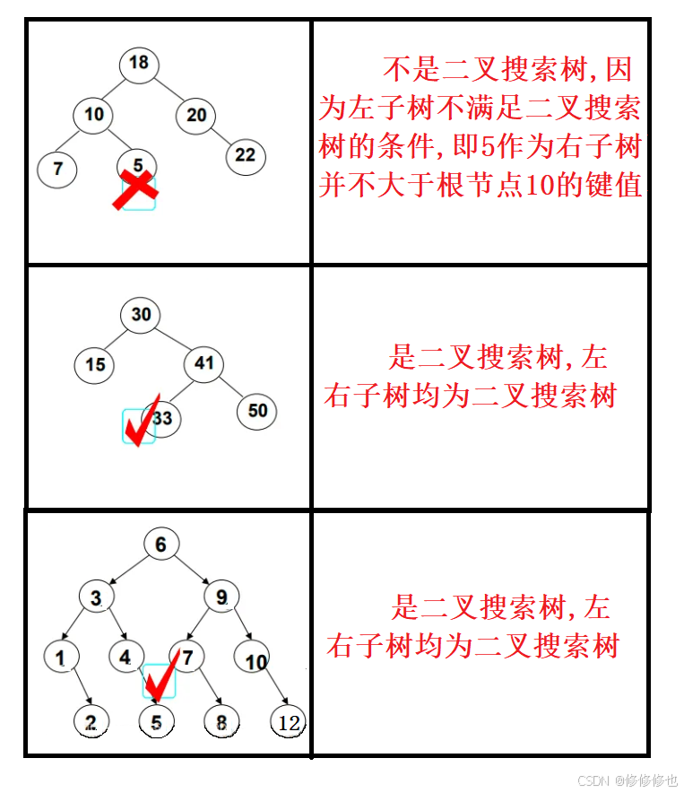 下图罗列了部分属于/不属于二叉搜索树的二叉树以供参考: