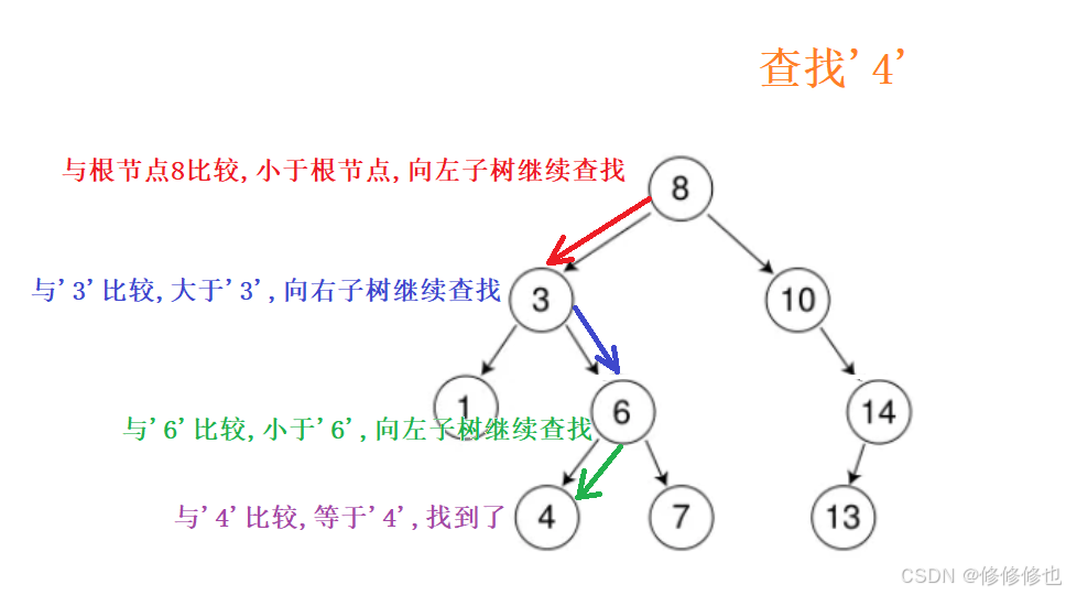1. 从根节点开始比较查找, 如果查找值比根结点值大,则往右子树继续查找; 如果查找值比根结点值小,则往左子树继续查找;
