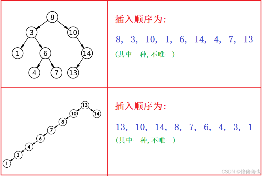 但对于同一个关键码集合,如果各关键码插入的次序不同,可能得到不同结构的二叉搜索树: