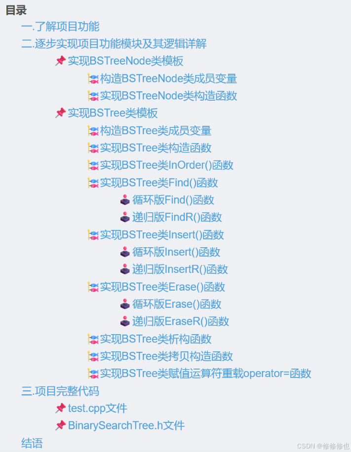 由于本文偏向理论概念,篇幅有限,因此关于使用C++具体实现二叉搜索(排序)树的详细过程我放在下面这篇文章中了,有需要的朋友可以移步这篇博客,里面有非常详细的使用C++实现二叉搜索(排序)树的详解:【C++】模 拟实现 二叉搜索 (排序) 树