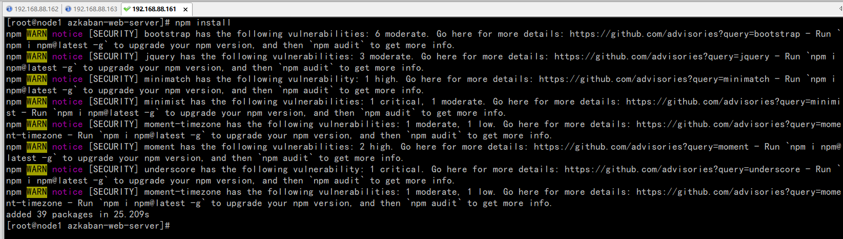 azkaban目录下的 azkaban-web-server目录下执行npm install将所有前端组件加载到node_module模块中,会有个npm WARN不用管。