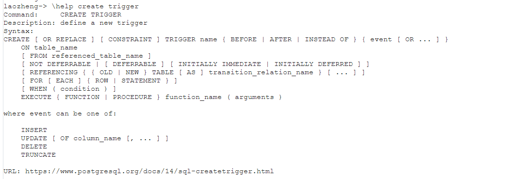 CONSTRAINT选项被指定,这个命令会创建一个 约束触发器 。这和一个常规触发器相同,不过触发该触发器的时机可以使用调整。约束触发器必须是表上的AFTER ROW触发器。它们可以在导致触发器事件的语句末尾被引发或者在包含该语句的事务末尾被引发。在后一种情况中,它们被称作是被 延迟 。一个待处理的延迟触发器的引发也可以使用SET CONSTRAINTS立即强制发生。当约束触发器实现的约束被违背时,约束触发器应该抛出一个异常。