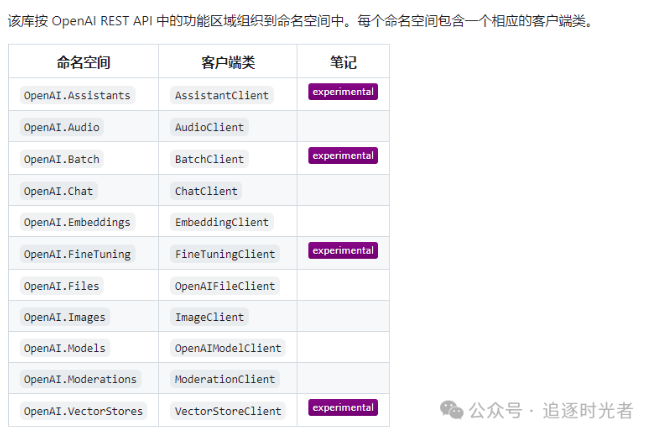 命名空间组织:该库按 OpenAI REST API 的功能区域组织成不同的命名空间,每个命名空间包含对应的客户端类。 -