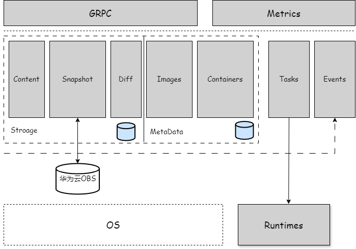 • containerd 通过插件架构实现功能扩展,其中存储快照(snapshotter)是负责管理容器镜像层(Layer)的插件。OBS 作为后端存储需要自定义开发 snapshotter 插件,用于将容器镜像层存储到 OBS 中。
