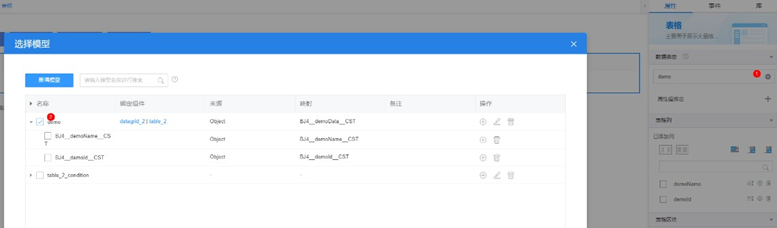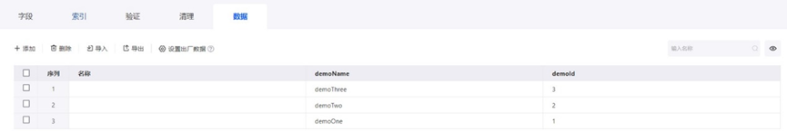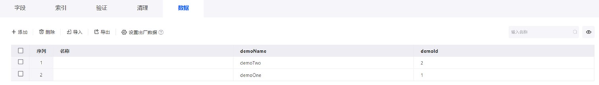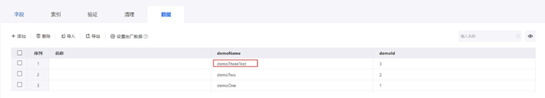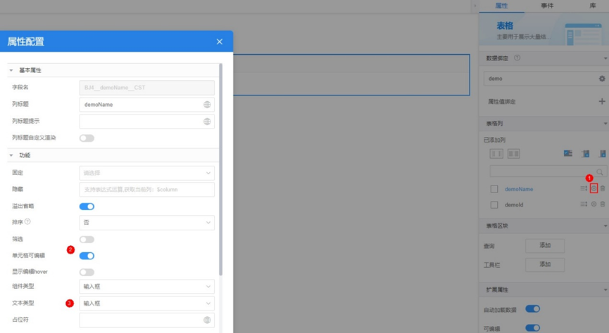 例如,在已添加列中,单击demoName后的齿轮按钮,将列设置为可编辑。按照上述操作,将demoId列也设置为可编辑。