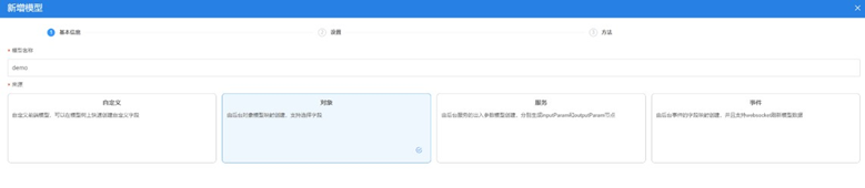 (2)单击“新增模型”,输入模型名称、“来源”选择“对象”,单击“下一步”。