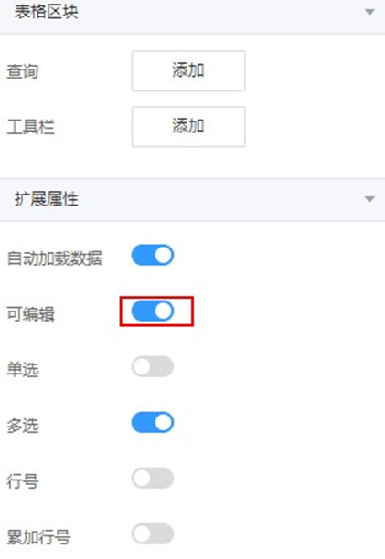 (1)选中表格组件,在“属性 > 表格区块”中,单击工具栏后的“添加”。