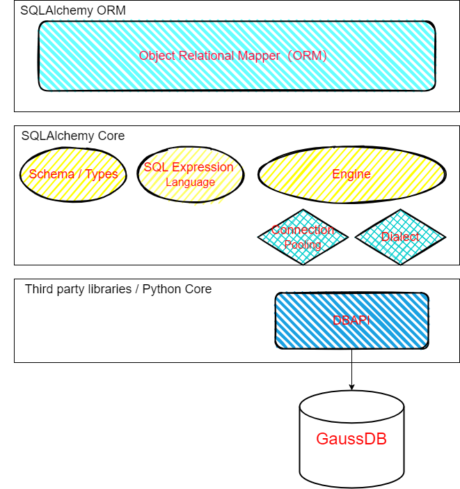 • Fork SQLAlchemy仓库(https://github.com/sqlalchemy/sqlalchemy/tree/main/lib/sqlalchemy/dialects), 开发SQLAlchemy相关的DBAPI以及SQLAlchemy Dialect(方言)插件开发,然后通过实现GaussDB的Dialect定义来完成对接GaussDB数据库。