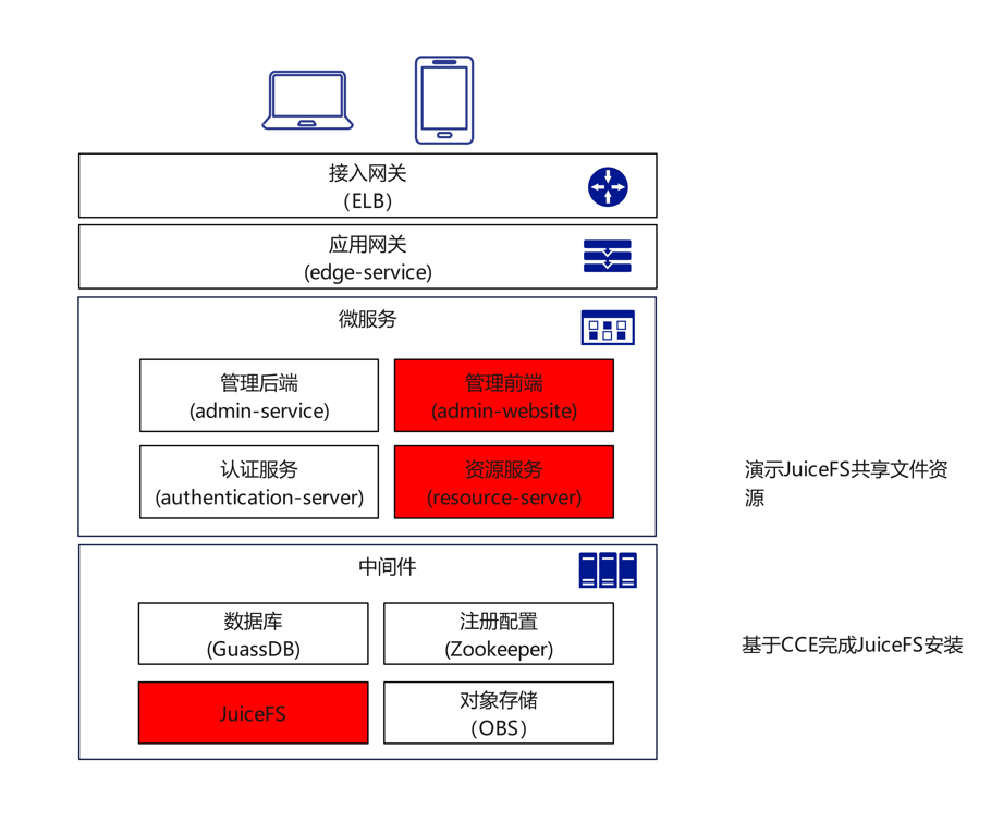 DEMO基于ServiceComb微服务架构,构建一个云原生环境下的文件共享与存储系统,展示如何在Kubernetes集群上通过JuiceFS共享文件资源,将文件存储到对象存储OBS中。