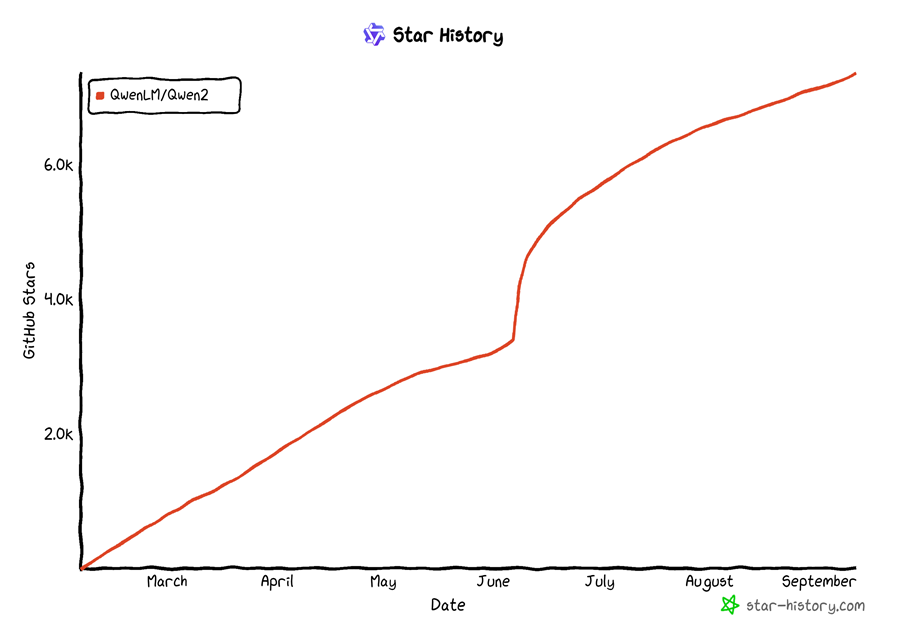 截至 2024 年 9 月11日,Qwen 2项目在 GitHub 上的 star 数量已超过 7.4k,fork 数量超过 400,项目的贡献者数目为 25名。最近一次代码提交时间为 2024 年 9 月 1 日。以下是 Qwen 项目的 star 历史图: