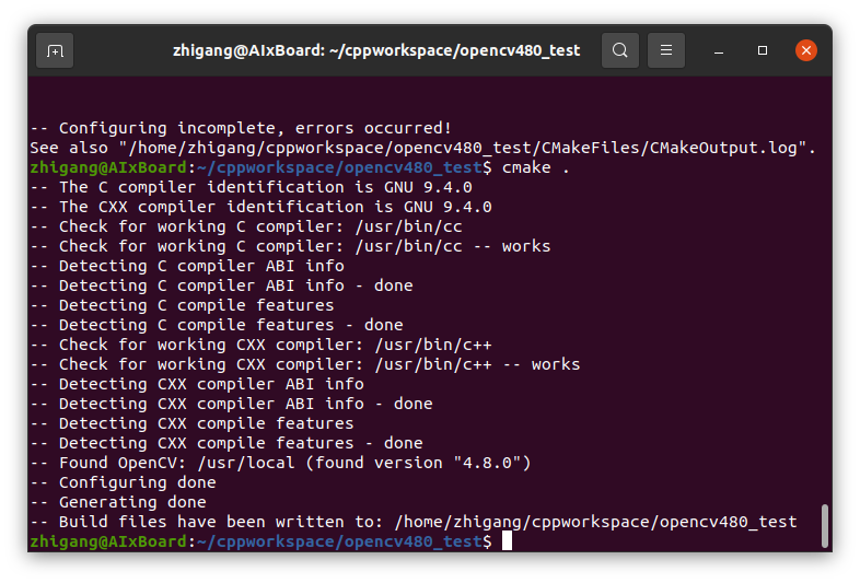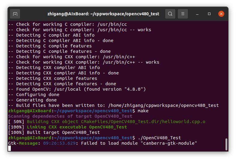 运行一个简单的OpenCV图像显示的程序验证OpenCV4.8 C++开发环境的正确性。重新打开一个终端命令行窗口,运行下面的命令行: