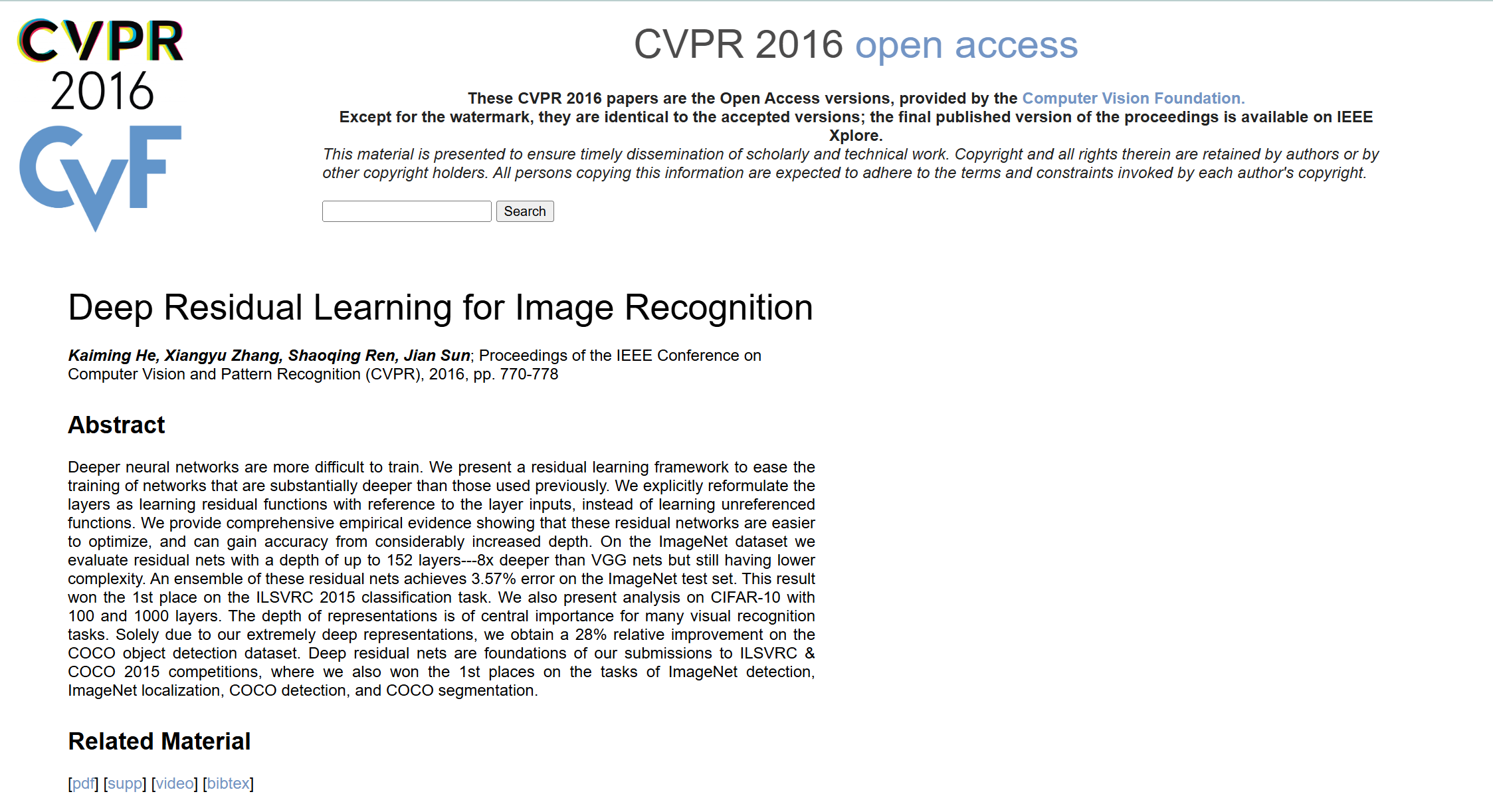残差网络这一思想的起源是在2016年论文**《Deep Residual Learning for Image Recognition》**中第一次被提出,目前的引用已经高达3w,现代的深度卷积神经网络大多都是使用此网络模型结构。