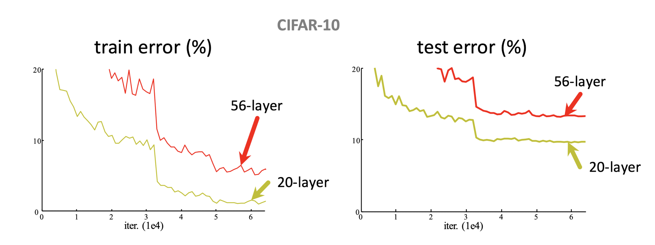 在CIFAR-10、imageNet等数据集上,单纯增加3x3卷积,训练和测试的误差都变大了。但这并不是过拟合的问题,因为56的网络的训练误差同样很高。这主要是深层网络中存在着梯度消失或者爆炸问题,模型的层数越多则会越难训练。