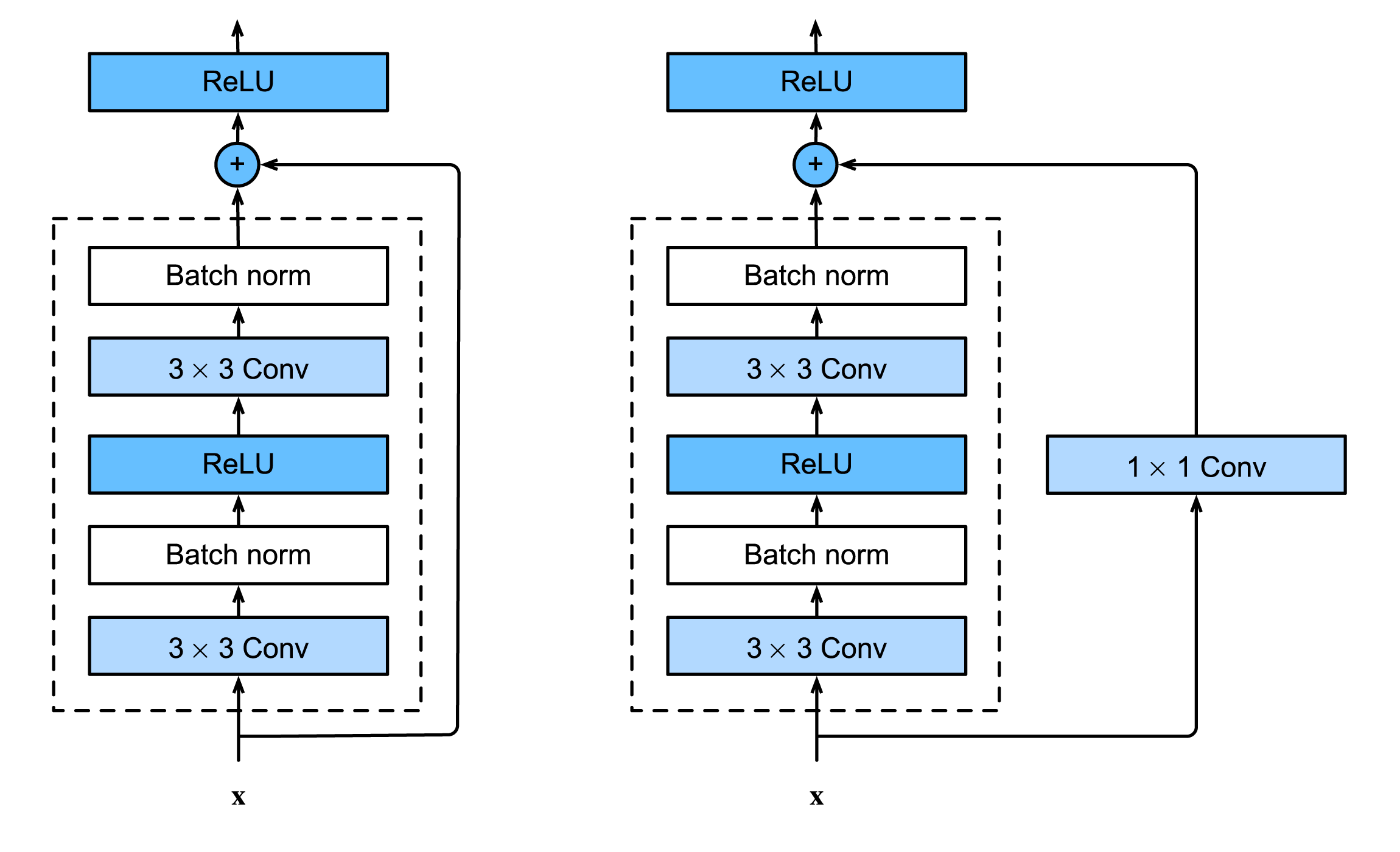 具体实现上,残差网络有集中构建方式,如上图所示。上图中左侧虚线部分的输出和x直接相加,右侧的x经过1x1卷积层(此处的1x1卷积层就是上文中的恒等映射=>第二张图片)再与虚线部分相加。虚线部分包含了两个3x3卷积层。左侧虚线部分能和输入x直接相加的前提是,虚线里的3x3卷积层没有改变x的维度,可以直接相加。因为如果一旦改变了x的维度,一种办法是使用1x1的卷积层直接相加(肯定不会改变x的维度),另一种是用0填充x。