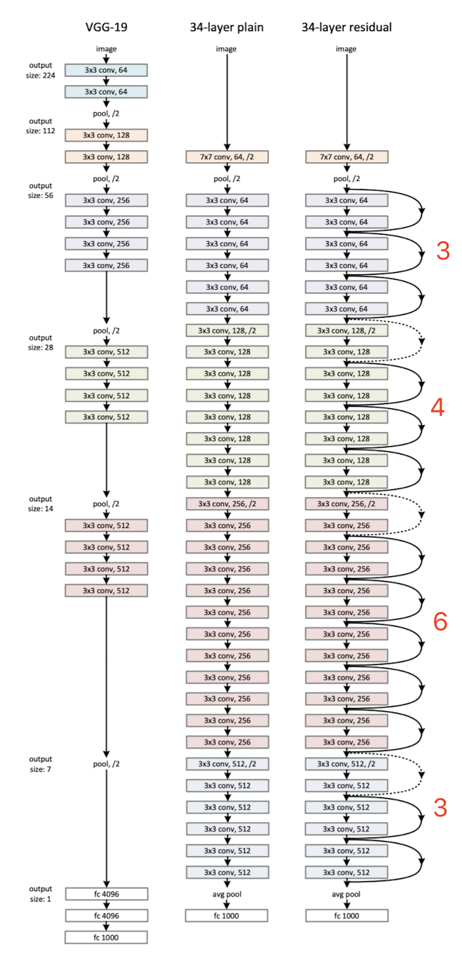 最右侧是ResNet-34,命名为ResNet-34,是因为网络中7×7卷积层、3×3卷积层和全连接层共34层。在计算这个34层时,论文作者并没有将BatchNorm、ReLU、AvgPool以及Shortcut中的层考虑进去。右侧ResNet-34中的3×3卷积层的颜色不同,共4种颜色。每种颜色表示一个模块,由一组残差基础块组成,只不过残差基础块的数量不同,从上到下依次是[3, 4, 6, 3]个残差基础块。另外,图4右侧,残差基础块中用实线Shortcut表示维度没有变化(可以直接相加);虚线Shortcut表示维度变化了,比如通道数从64变为128,无法直接相加,或者在xx上填充0,或者使用1×1卷积层改变维度。