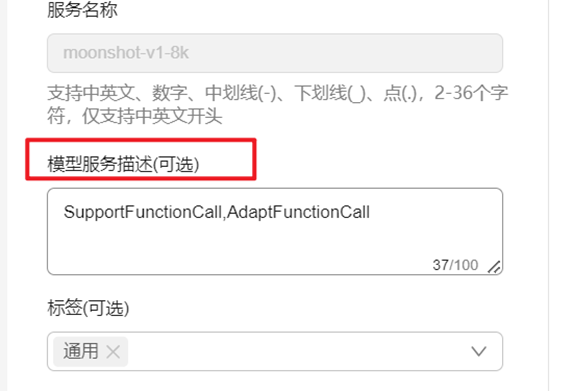 自接入模型的时候在模型服务描述里面填入SupportFunctionCall,AdaptFunctionCall(前提是模型本身支持functioncall)