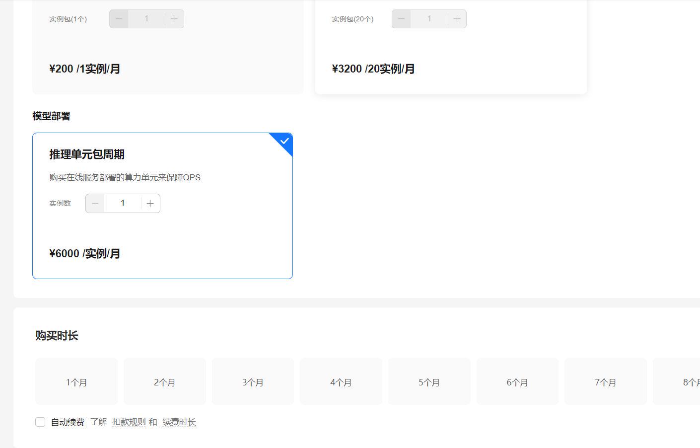 点击快速订购——>自由订购——>包年包月——>推理单元包周期,按照部署模型的描述需要几个就购买几个推理单元
