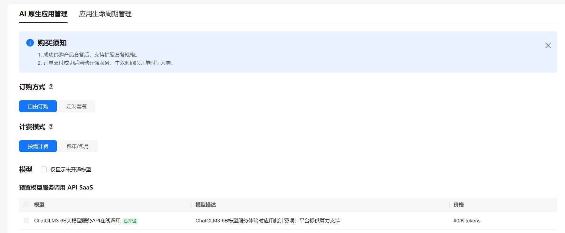 点击快速订购——>自由订购——>按需计费——>ChatGLM3-6B大模型服务API在线调用