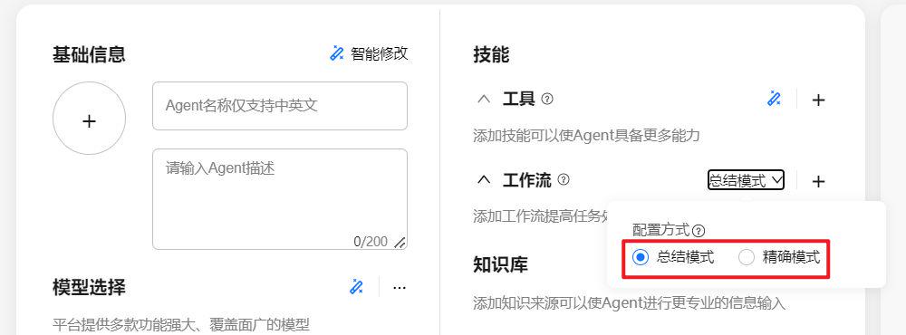 agent编排处,工作流有总结模式和精确模式,选择总结模式,大模型会对工作流的输出进行总结,选择精确模式,则大模型不会总结直接输出工作流的输出。